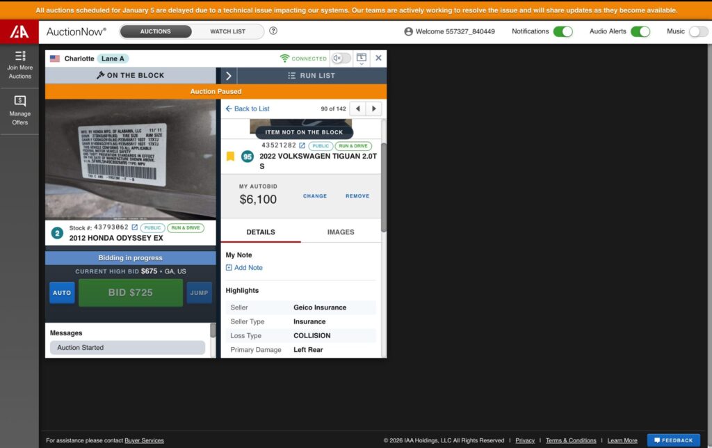 informuojame, kad šiandien (sausio 5 d.) IAAI aukcionai laikinai neveikia dėl techninio sutrikimo pačioje IAAI sistemoje. Tai yra oficialiai patvirtinta IAAI, o ne atskiros paskyros ar regiono problema.